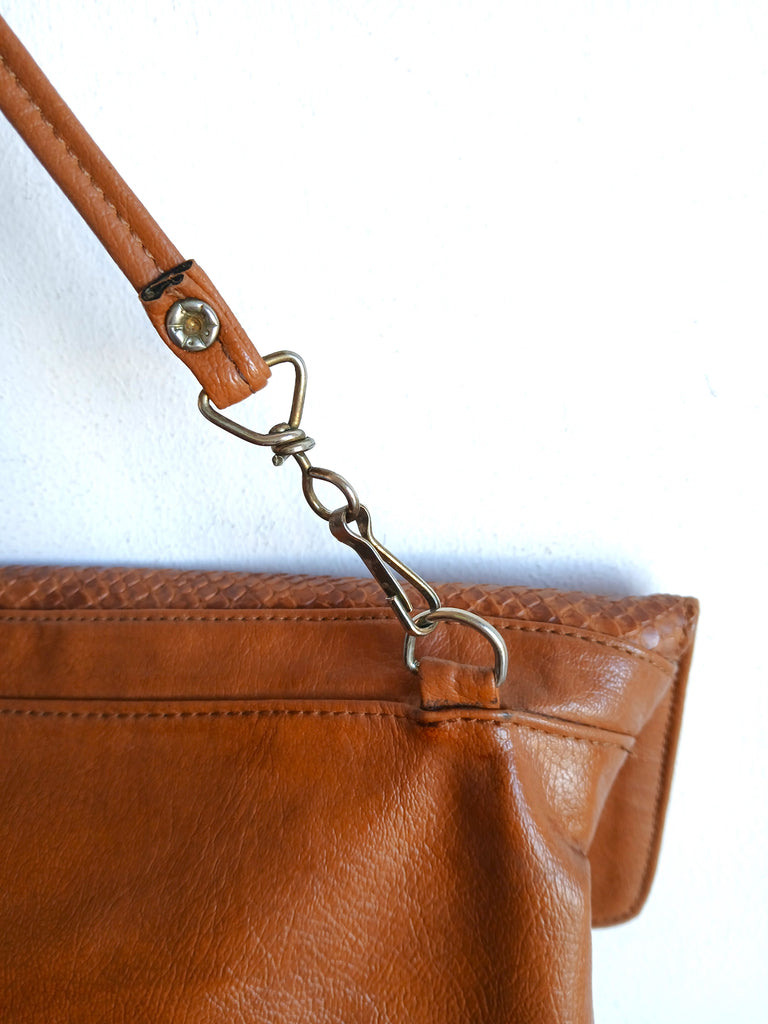 Bolso vintage de piel blanda grabada de color marrón con cierre de clic, correa al hombro y bolsillo interior con cremallera. El bolso está en muy buen estado, pero en el interior está manchado y lo dejo más baratao (el precio original sería 32€).