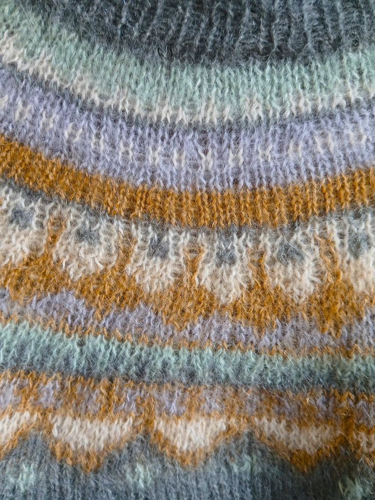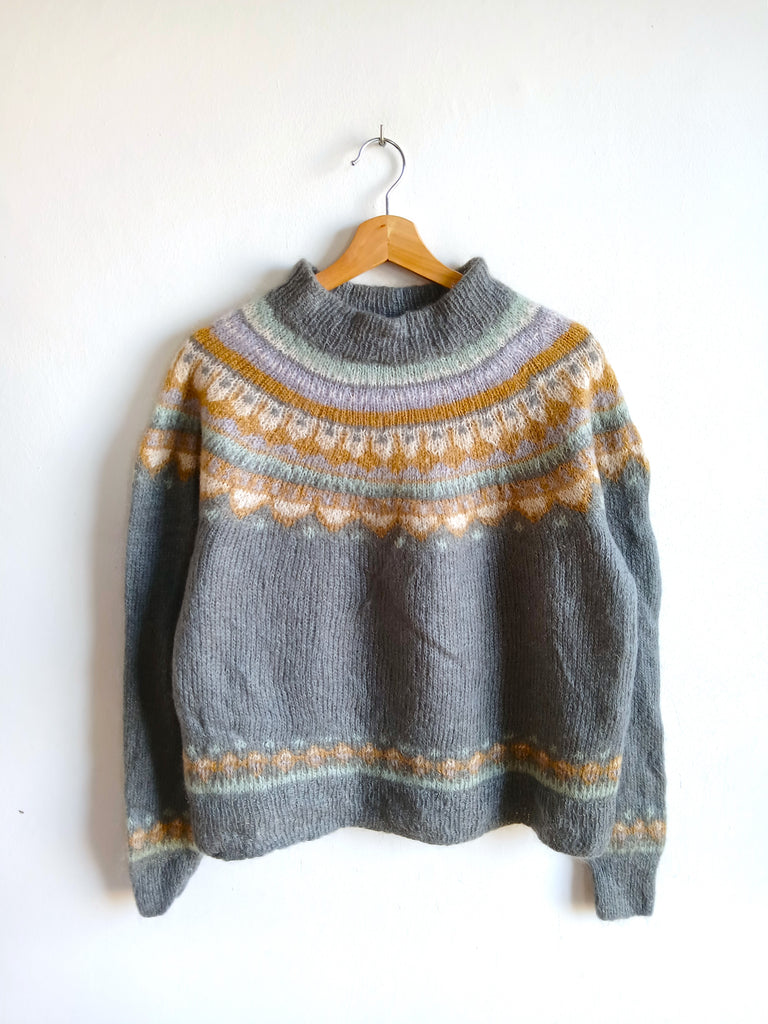 Jersey vintage hecho a mano de color gris con diseño invernal.