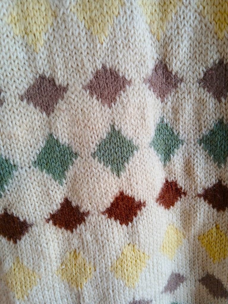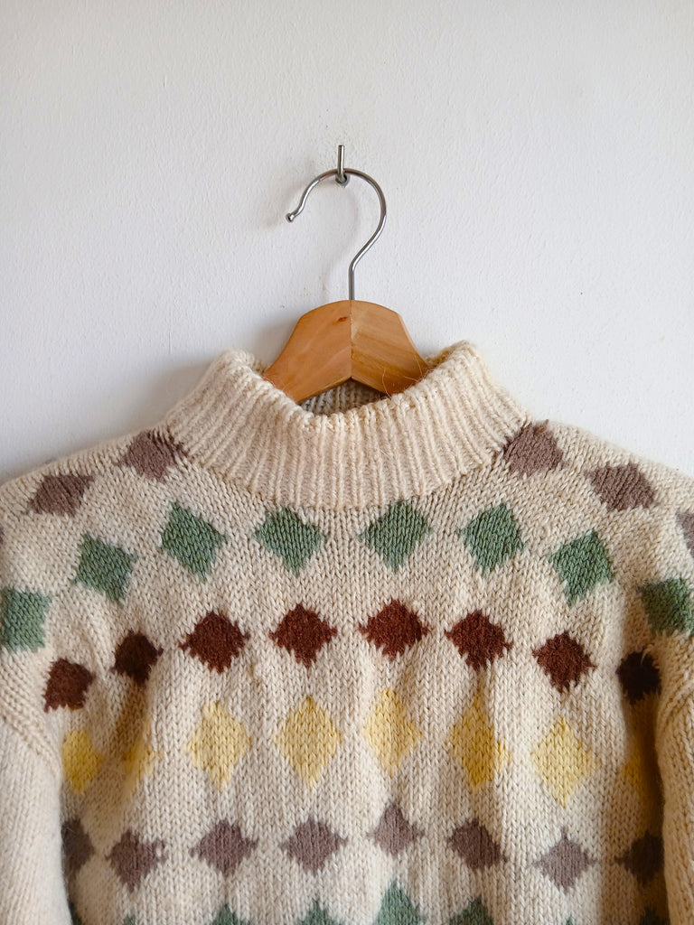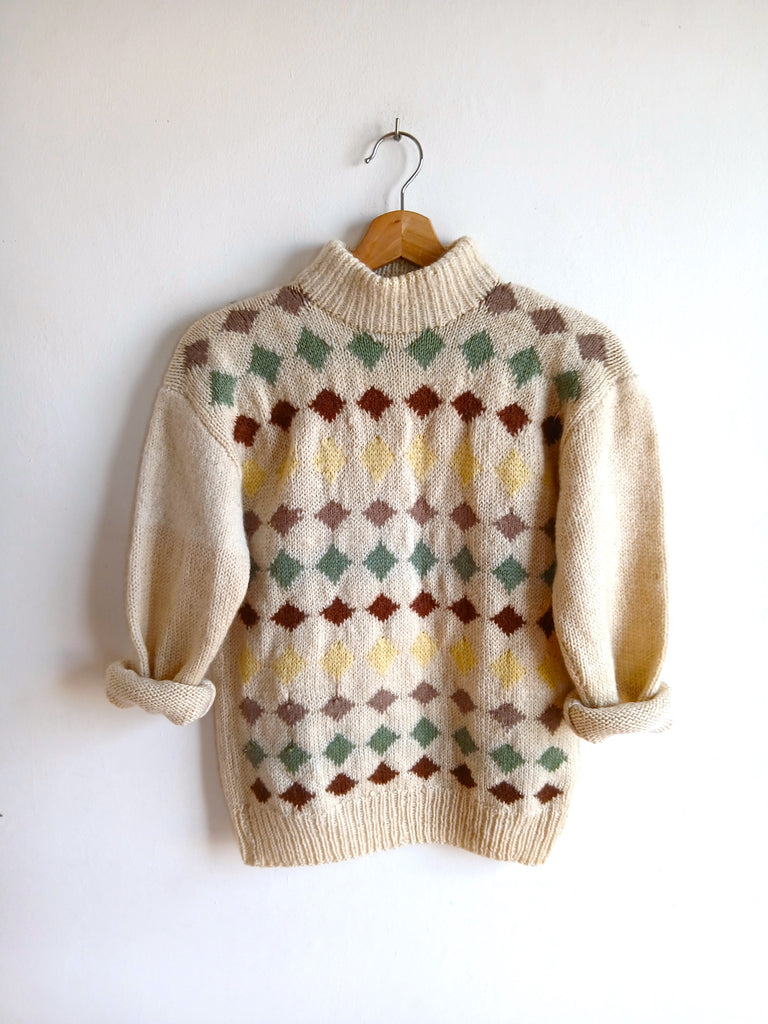 Jersey vintage hecho a mano de color crema con diseño de rombos de colores.