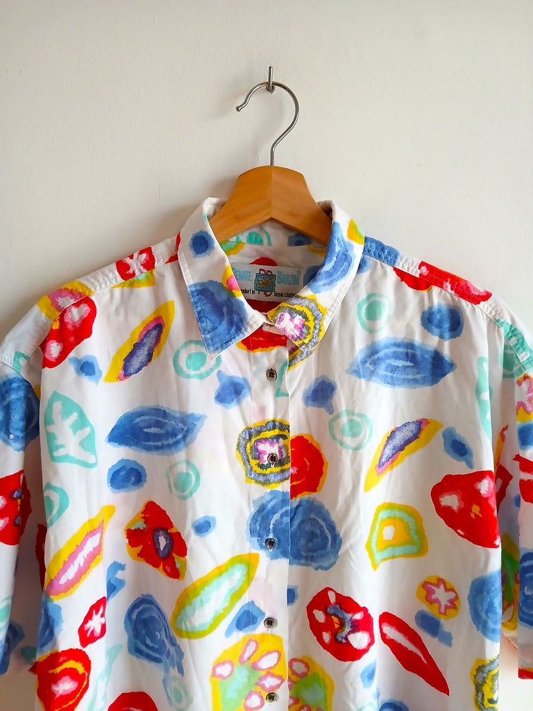 Camisa vintage de color blanco con estampado abstracto de flores de colores y botones originales.
