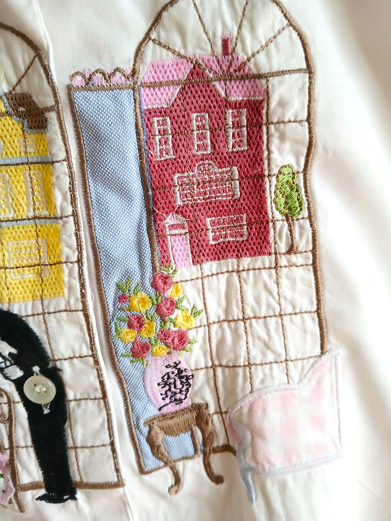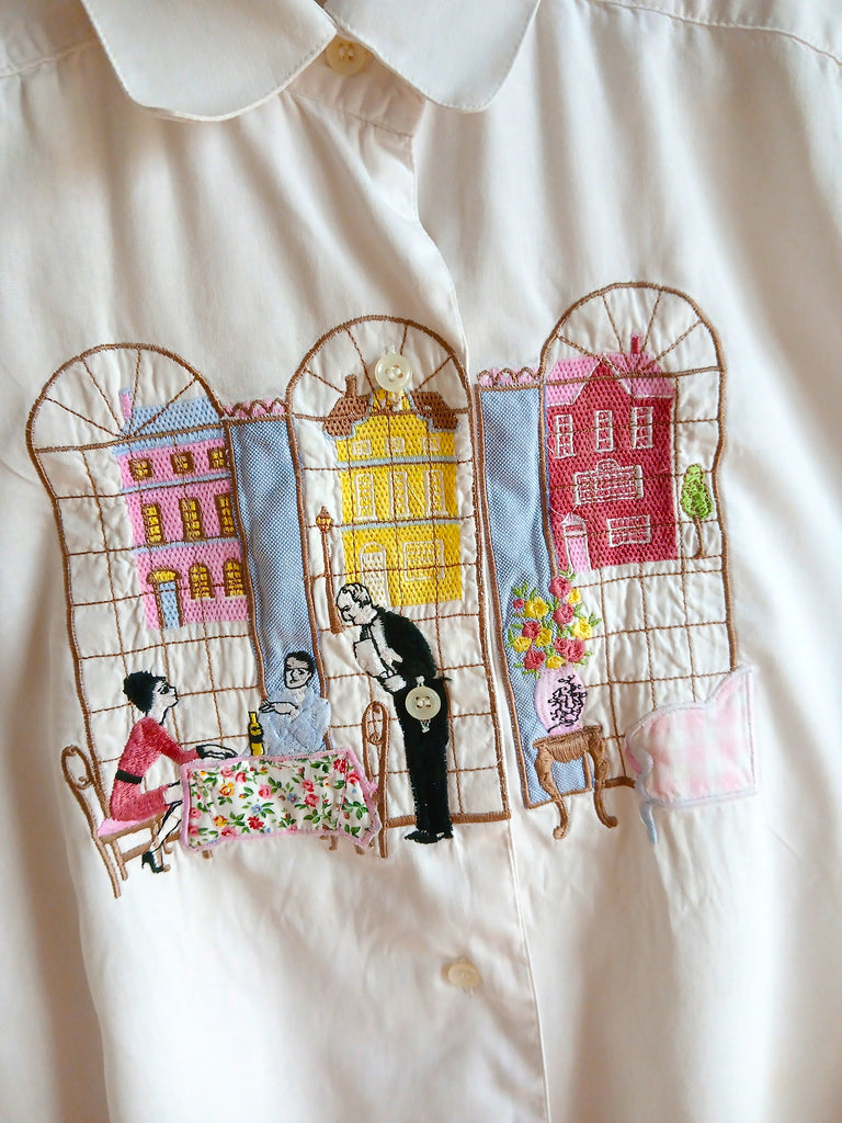 Camisa vintage de color blanco con unos bordados alucinantes de una cena en un restaurante.