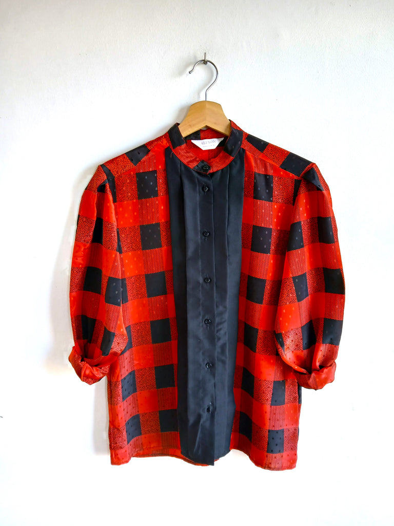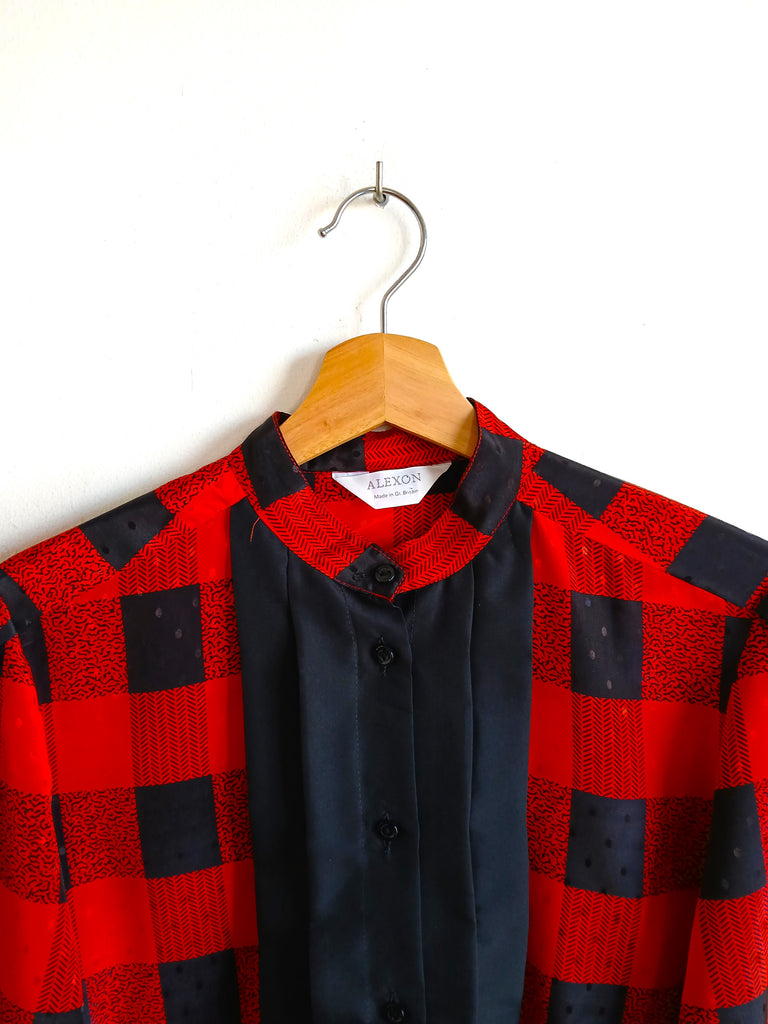 Camisa vintage de color rojo con estampado de cuadros negros y botones negros. Made in Great Britain.