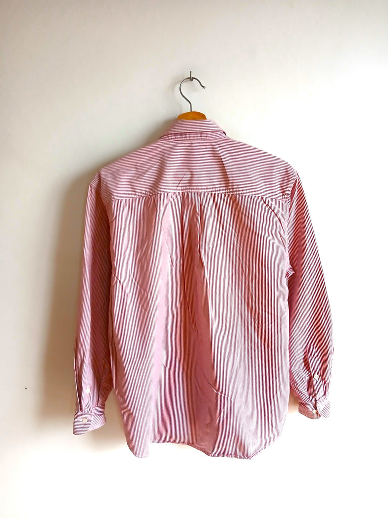 Camisa vintage de la marca italiana Emmanuel Schvili con rayitas rojas y bordados de un pueblo de montaña con personas y animalitos. Made in Italy.