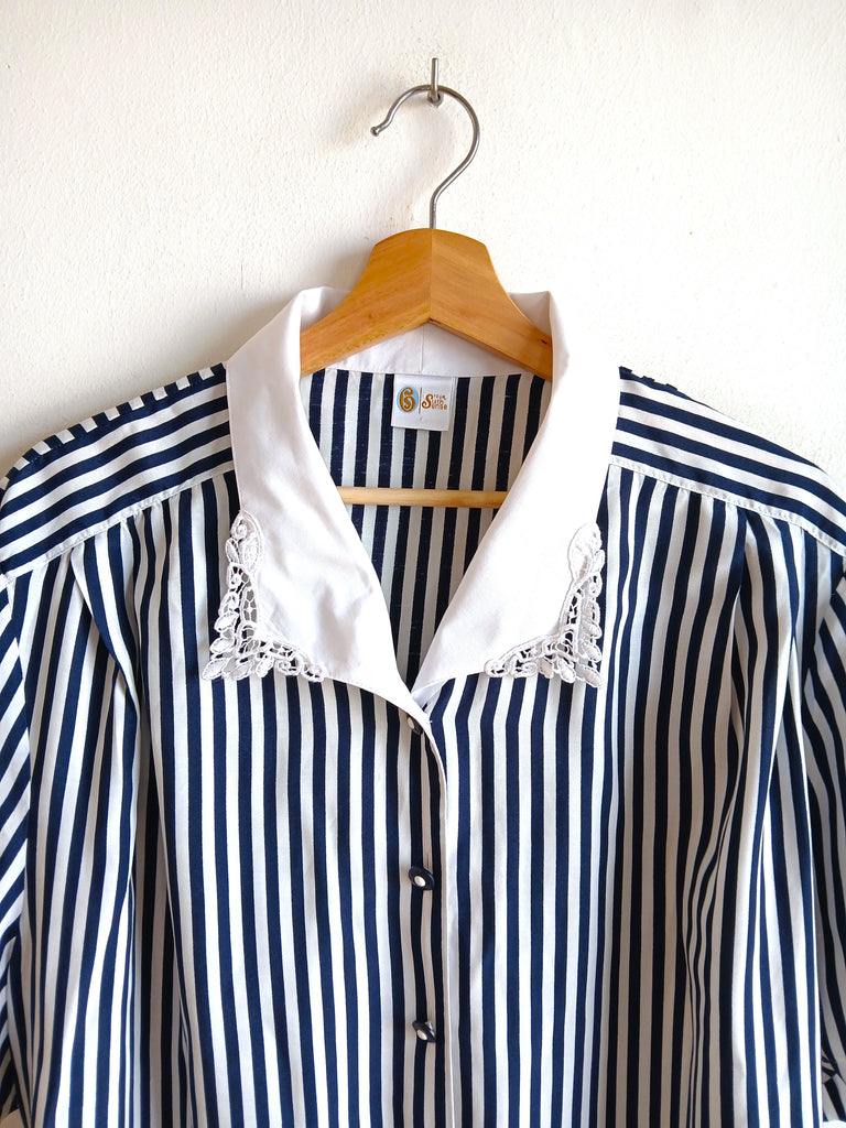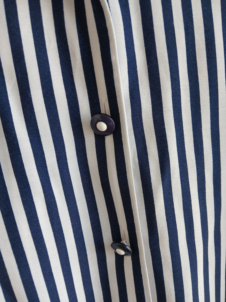 Camisa vintage con estampado de rayas de color azul marino y blanco con cuello y botones originales.