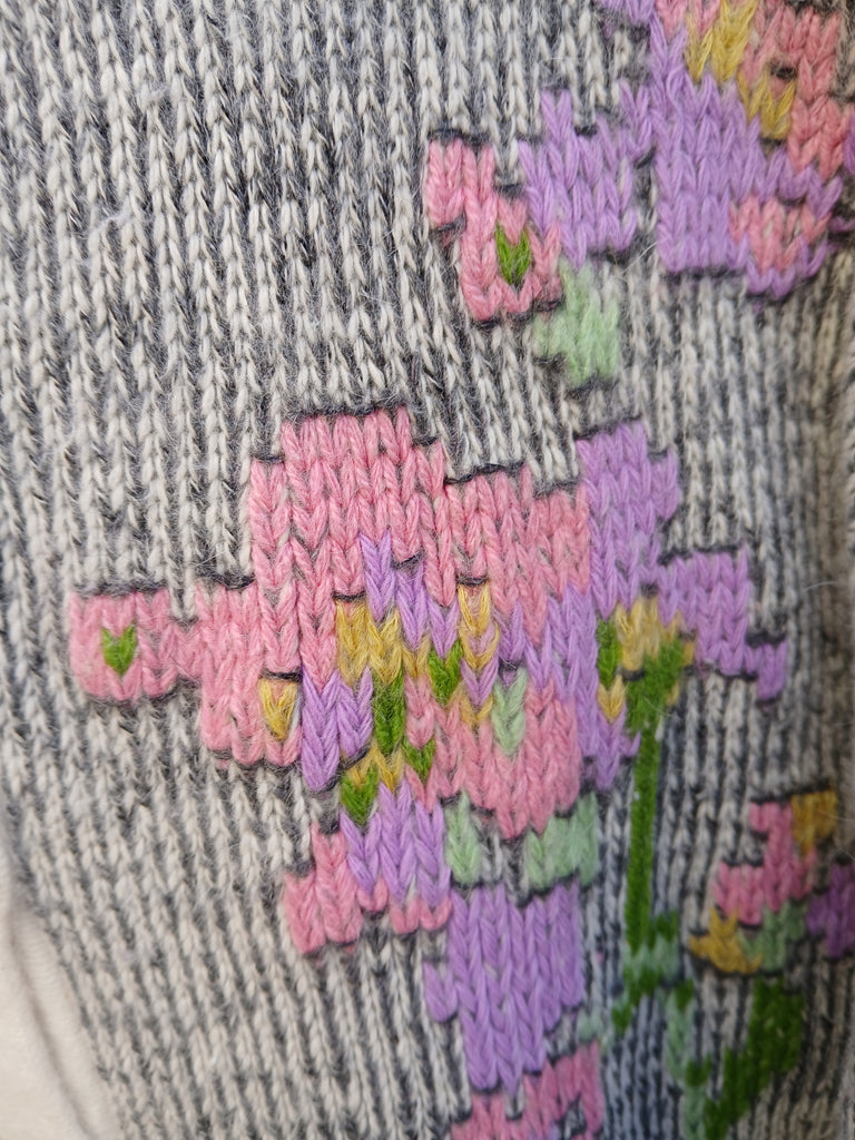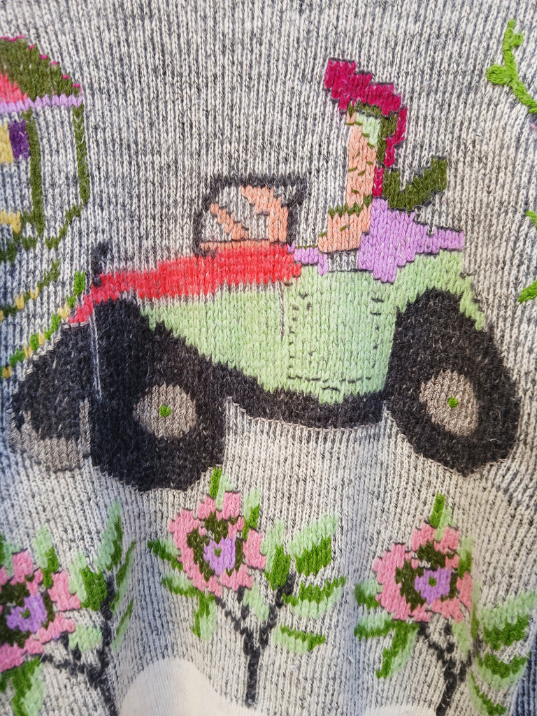 Chaqueta vintage de punto con botones blancos originales y diseño de colores por delante y por la espalda. Made in Italy.
