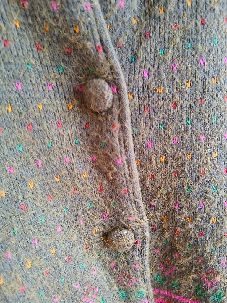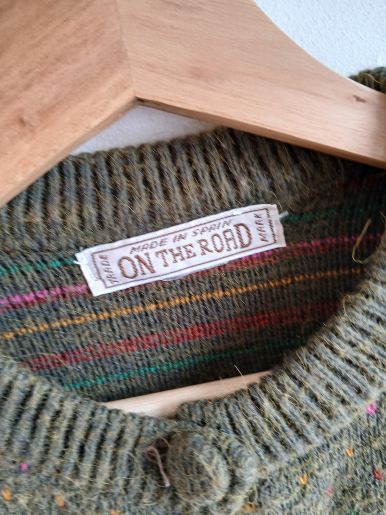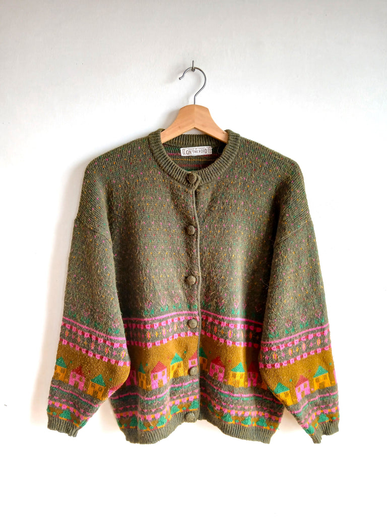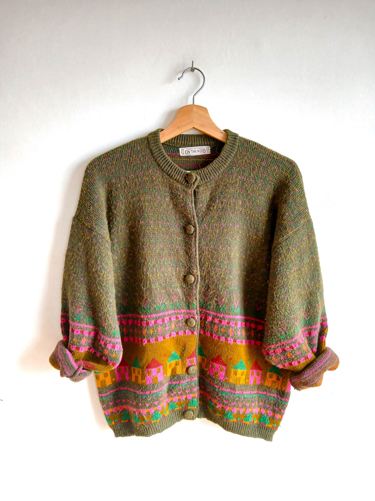Chaqueta vintage de color verde con diseño de casitas de colores y botones forrados. Made in Spain.