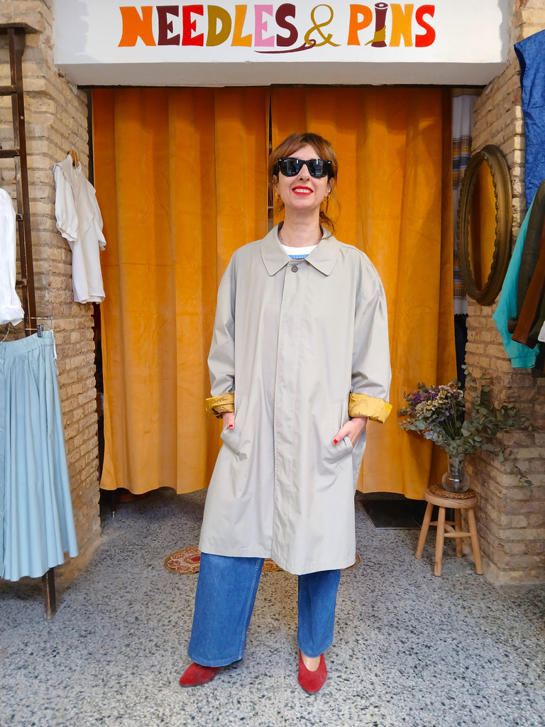Gabardina vintage de Incom con botones originales, bolsillos, forro y bolsillo interior.