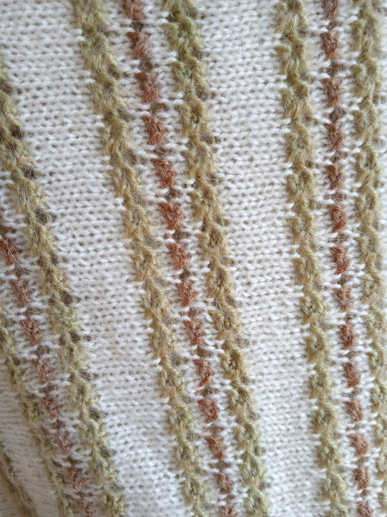 Jersey vintage hecho a mano de punto con diseño de rayitas y cuello vuelto.