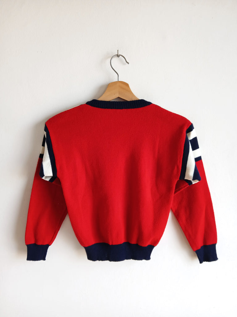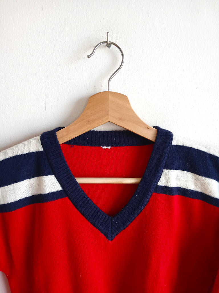 Jersey vintage de color rojo con diseño de rayas y cuello de pico.