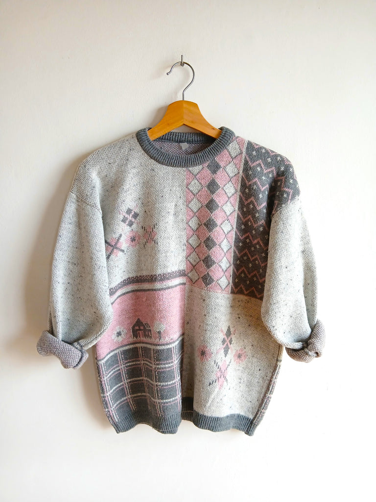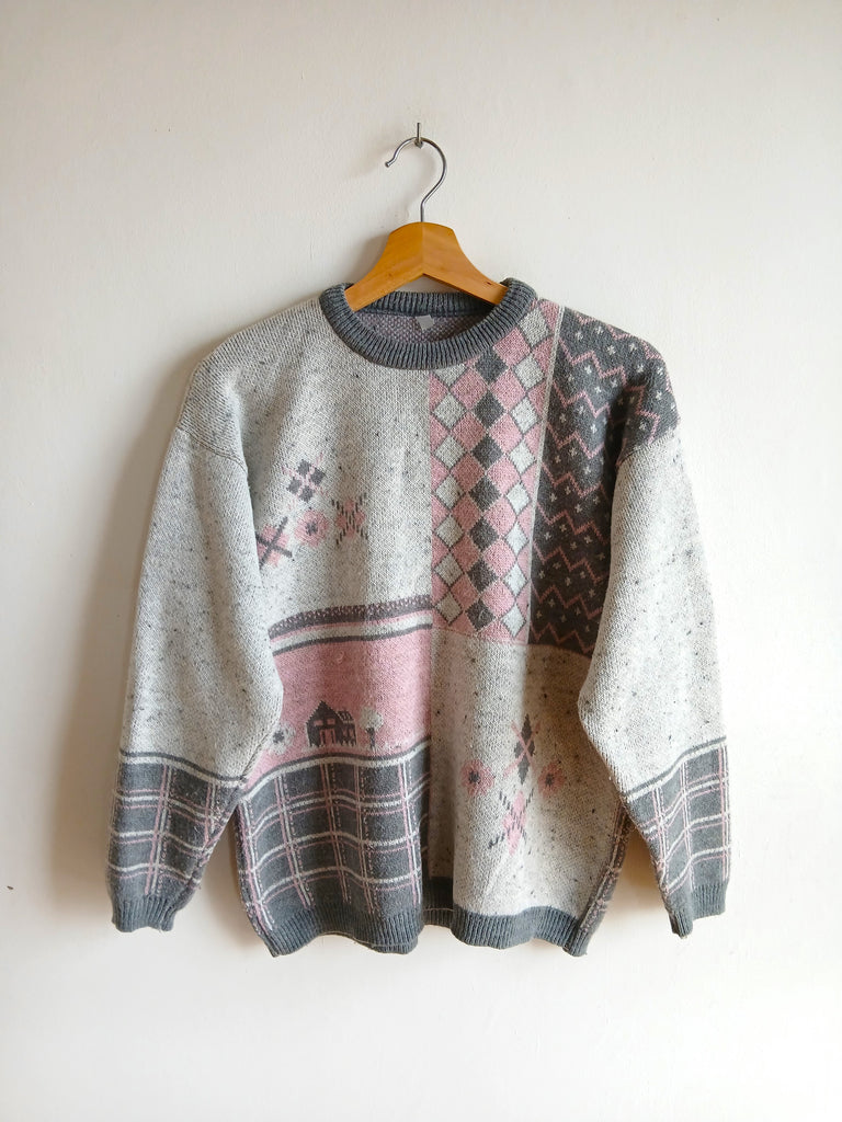 Jersey vintage en tonos grises y rosas con diseño.
